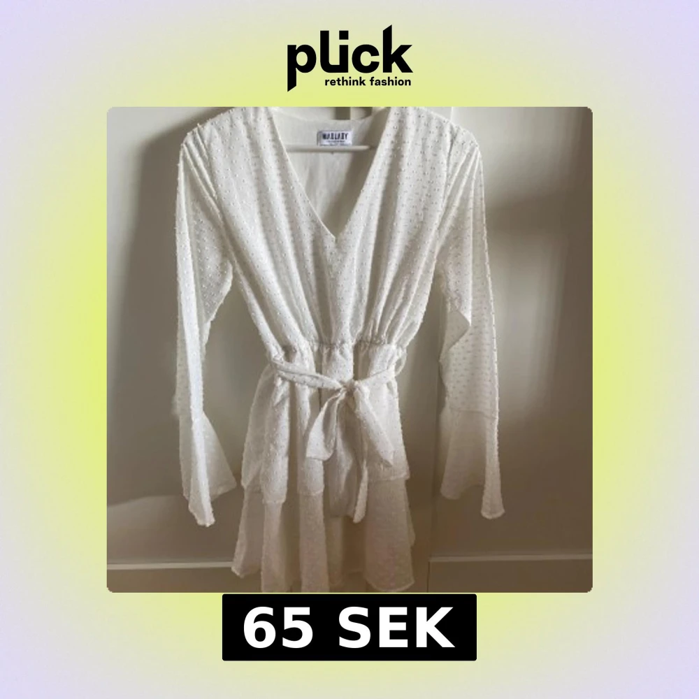 Superfin vit kortklänning från Madlady med v-ringning, volangdetaljer och knytband i midjan. Klänningen har långärmade ärmar med volang vid ärmslut och ett prickigt mönster i tyget.