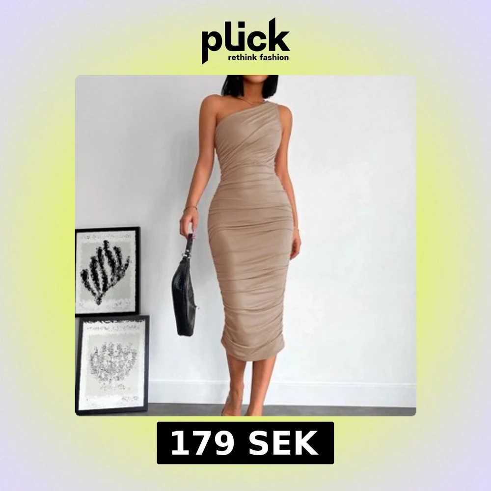 Elegant beige oneshoulder klänning med tight passform. Klänningen har en stilren design med rynkade detaljer längs sidorna och baksidan, vilket ger en smickrande siluett. Perfekt för en kväll ute eller en speciell tillställning. Den är helt ny oanvänd och ordinarie pris 229kr säljer den för 179
