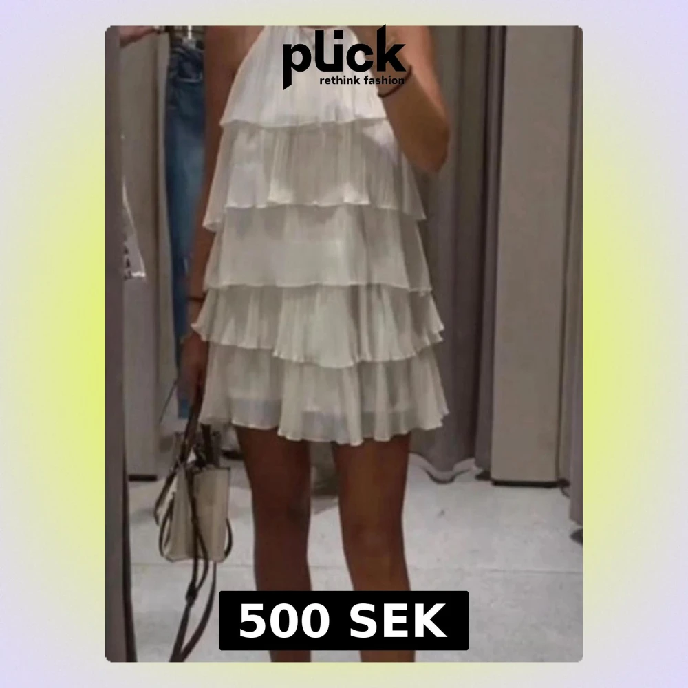 Säljer en söt vit kortklänning med flera lager volanger och halterneck. Klänningen är ärmlös och har en luftig, flowy passform som passar perfekt till sommaren. Perfekt för dig som gillar en romantisk och trendig stil.