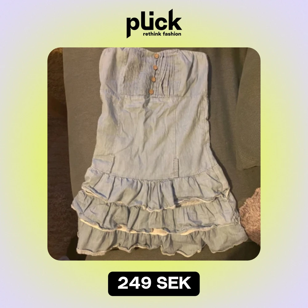 Axelbandslös jeansklänning med volanger, sååå snygg, strl S jag är ca 172, jättefin ljusblå färg💞 jättefint skick! har resårband uppe så åker inte ner och är sånt material i ryggen så passar XS också
