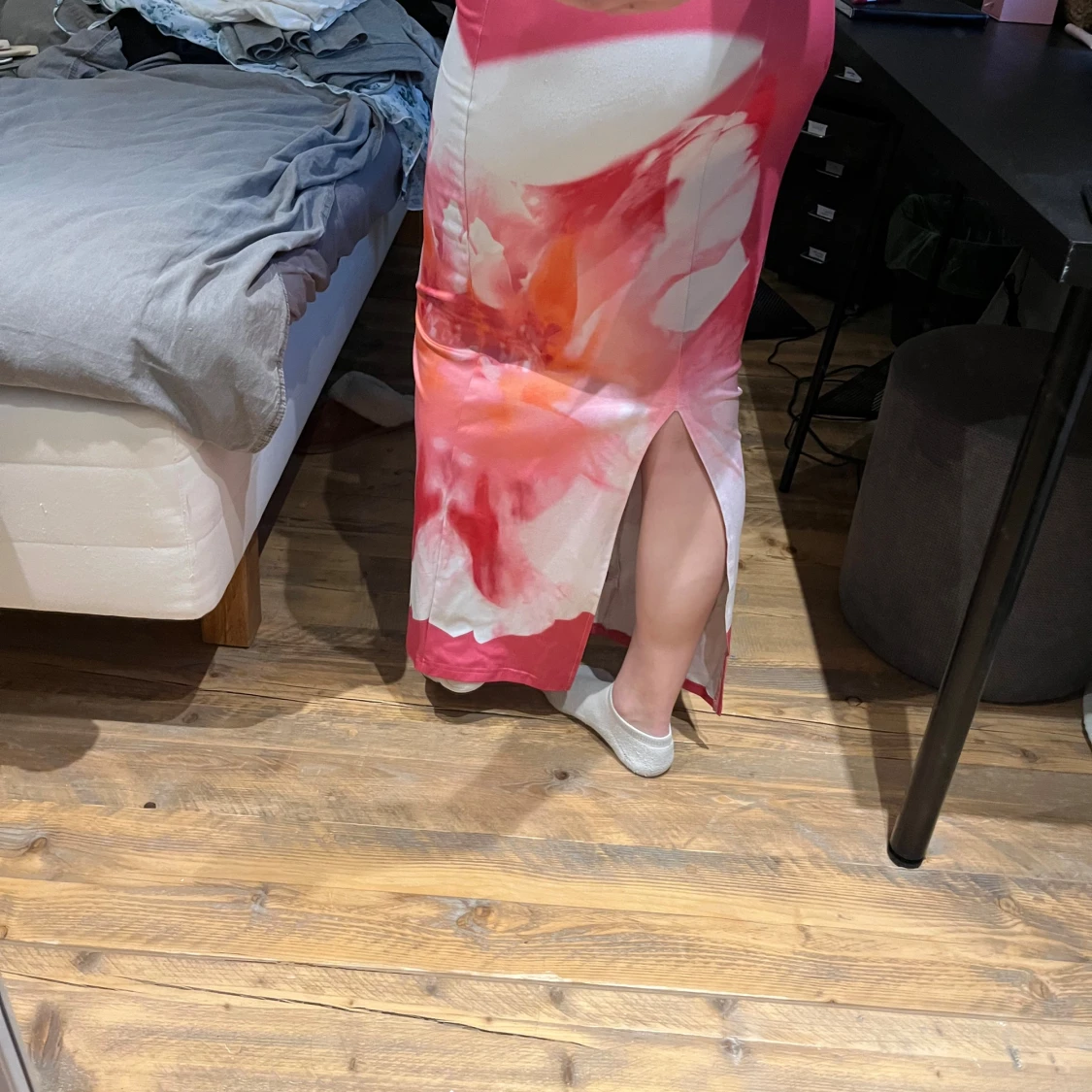 Säljer en snygg långklänning med blommigt mönster i rosa, vitt och rött. Klänningen har smala axelband, figurnära passform och en slits på sidan. Materialet känns mjukt och stretchigt.