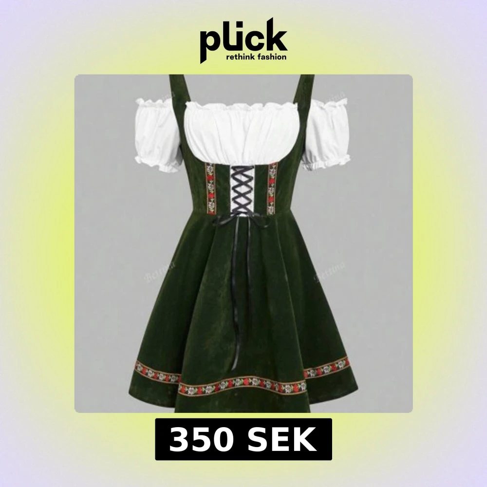 Supersöt grön kortklänning från Bettina med vit puffärm och snörning framtill. Klänningen har blommiga broderier längs midjan och nederkanten, samt omlottkänsla vid bysten. Materialet är mjukt och har en sammetliknande finish. Perfekt för dig som gillar traditionell stil med en modern twist.