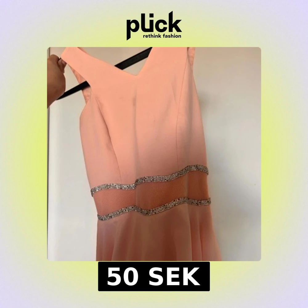 Superfin ljusrosa klänning med v-ringning och glittriga band i midjan. Dock är det några stenar som ramlar men inget som syns så mycket. Klänningen är ärmlös och har en dragkedja i ryggen samt smockade sidor för extra komfort. Materialet känns lätt och flowy, perfekt för sommarens tillfällen.