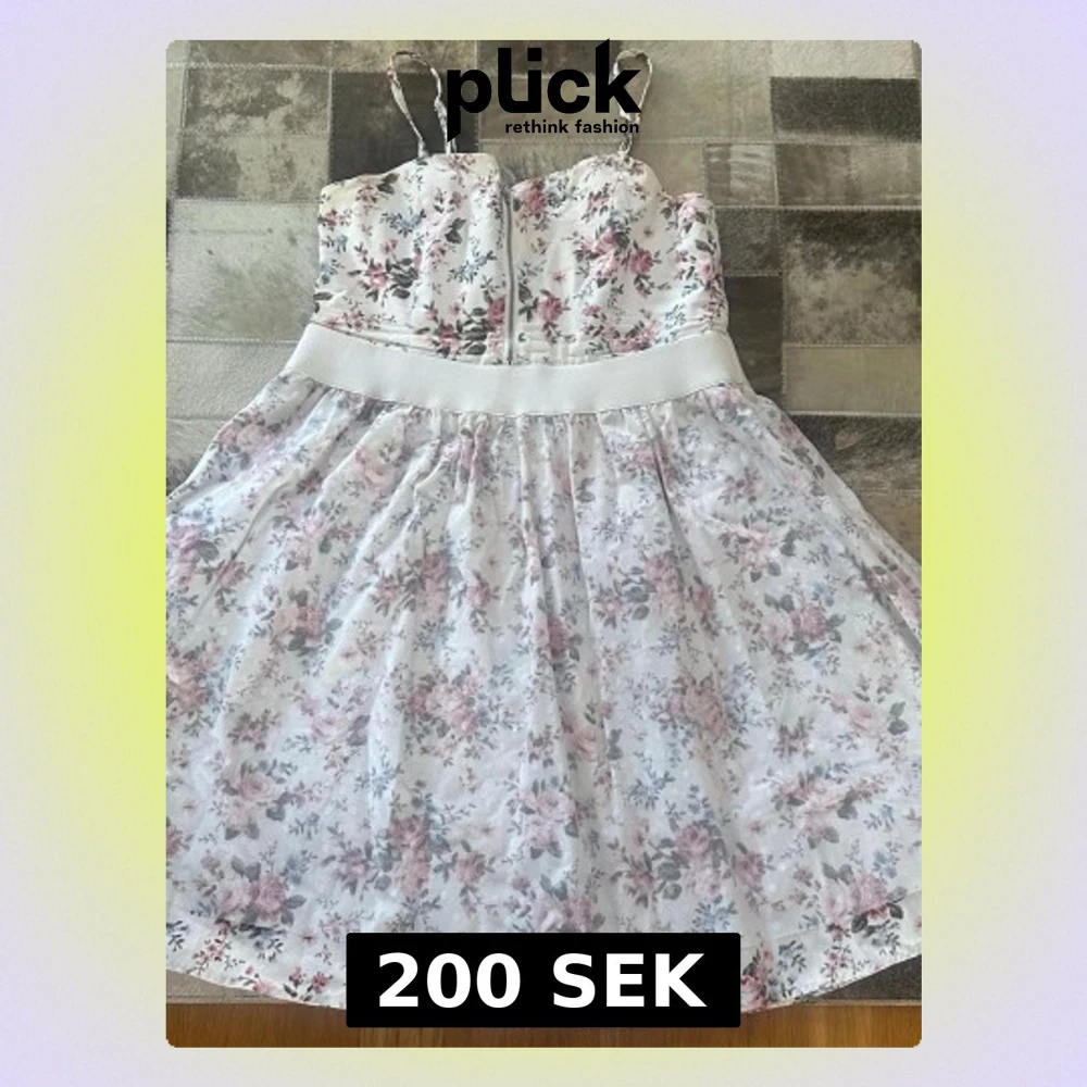 Söt kortklänning med smala axelband och blommigt mönster i rosa och lila toner på vit botten. Klänningen har en markerad midja med bred resår och lätt utställd kjol. Perfekt för varma dagar och har en romantisk känsla.