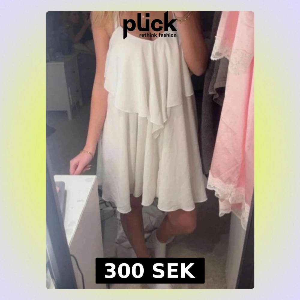 Säljer en vit kortklänning med omlott-design och volangdetaljer. Klänningen är ärmlös med tunna axelband och har en luftig passform som passar perfekt till varma dagar. Materialet känns lätt och bekvämt.