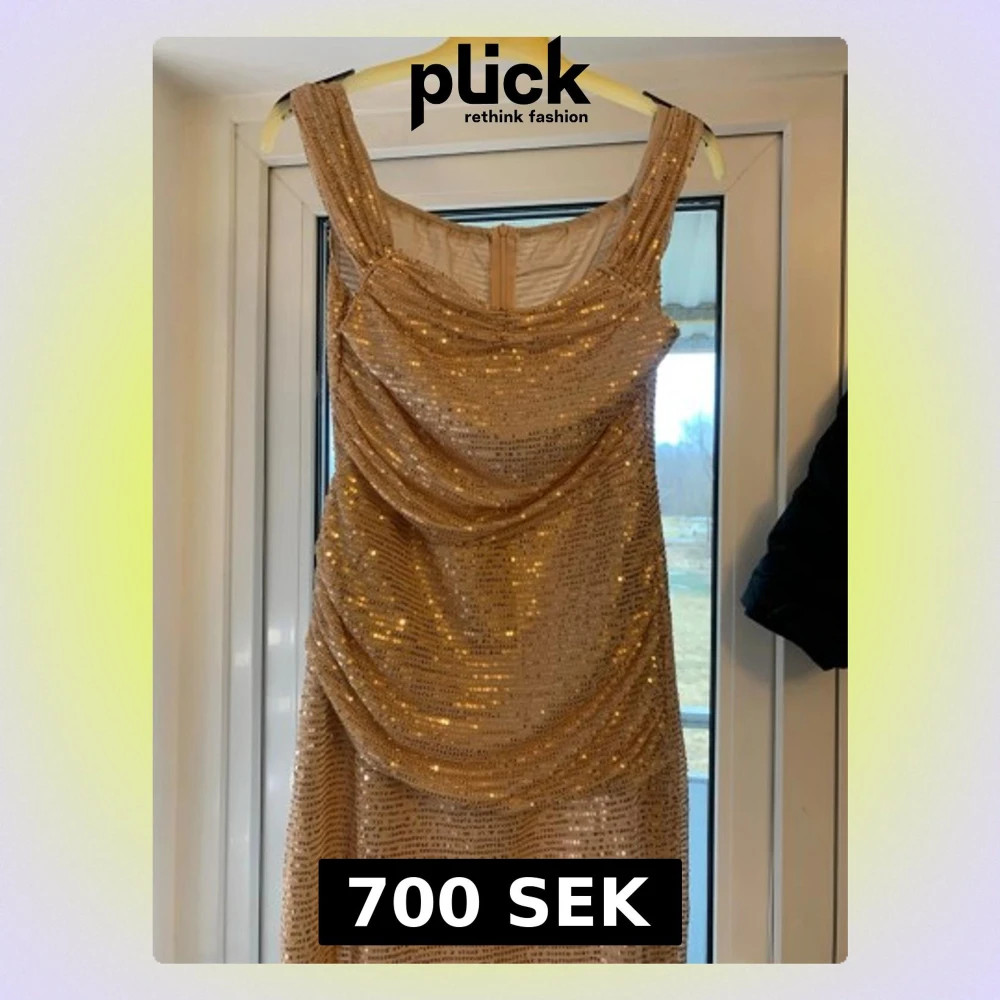 Snygg glittrigande klänning i champagnefärg med paljetter och draperad front. Klänningen har breda axelband och en smickrande passform som ger en elegant look. Perfekt för dig som vill sticka ut med stil💃✨👀