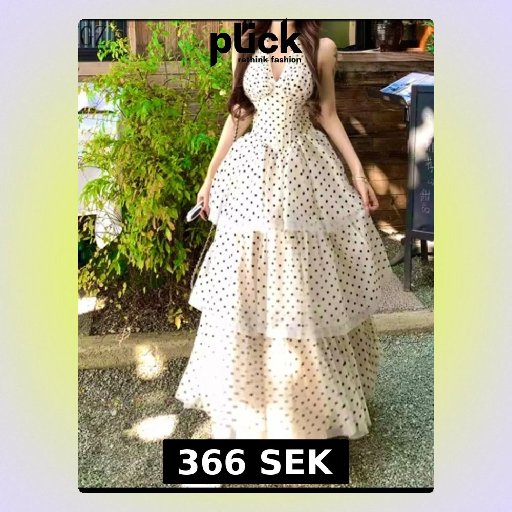 Supersöt långklänning i ljus beige med svarta prickar och flera lager volanger. Klänningen har halterneck, v-ringning och en luftig, flowy passform. Perfekt för sommarens alla tillfällen! Materialet känns lätt och svalt, troligen polyester eller liknande.