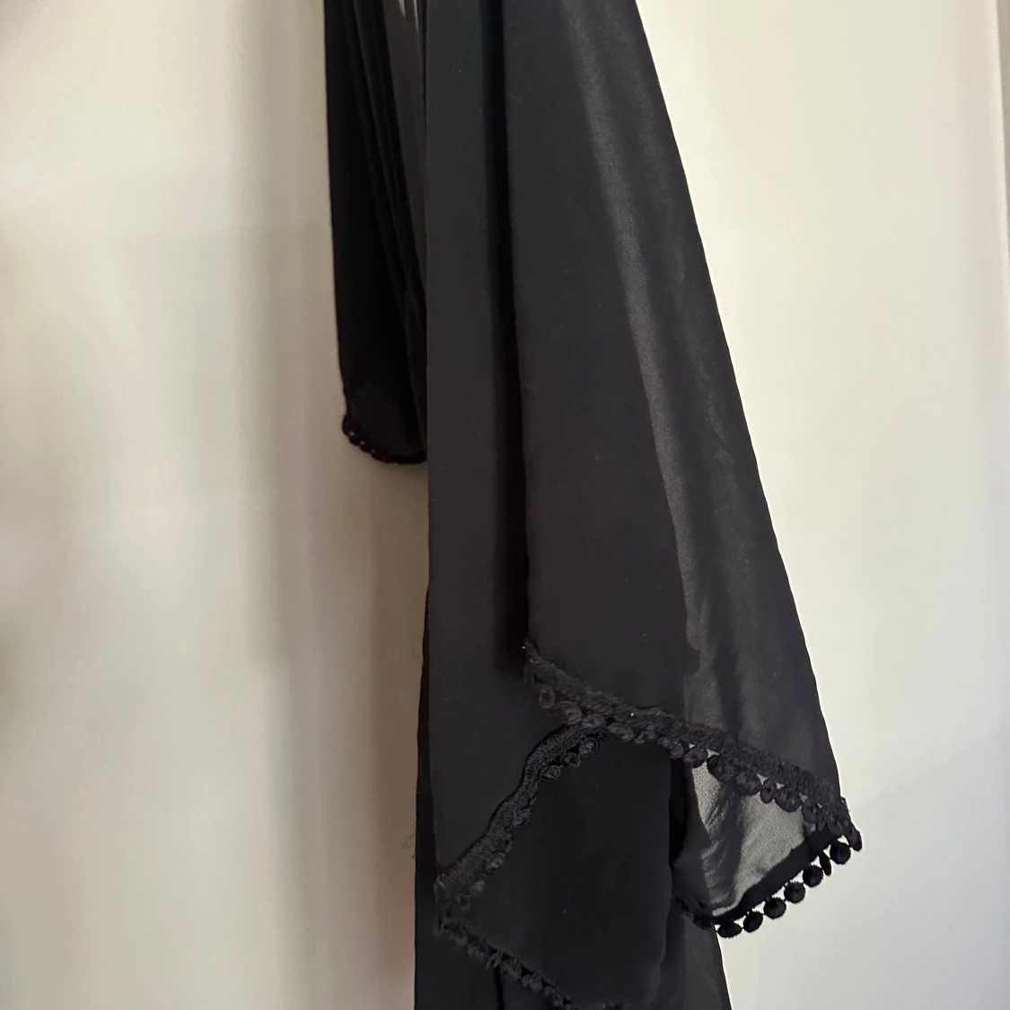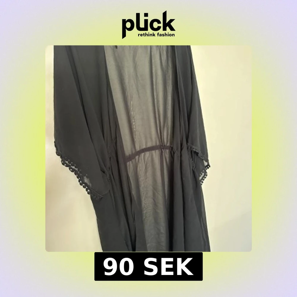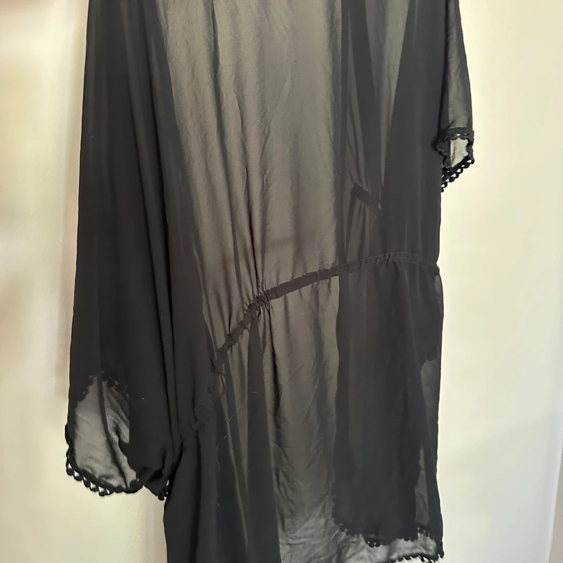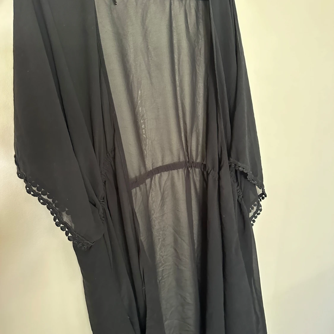 Svart strandklänning i tunn och transparent polyester med avslappnad passform. Klänningen har vida ärmar med dekorativ spetskant och små bollar längs kanterna. Perfekt för dig som gillar en bohemisk och chill vibe.