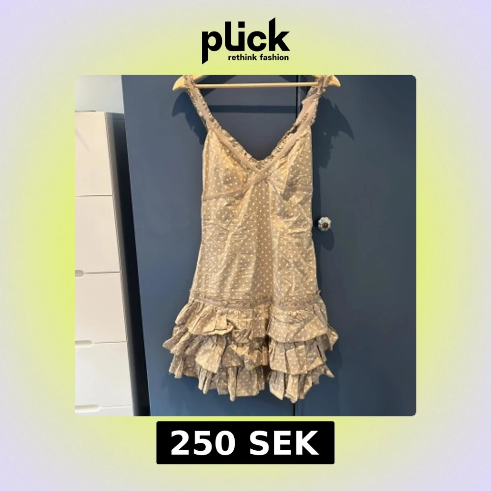 Supersöt kort klänning i beige med vita prickar och flera lager volanger nertill. Axelbandsmodell med v-ringning och rynkade detaljer.