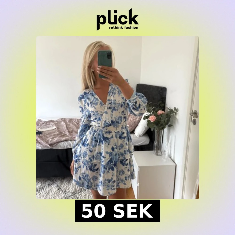 Superfin kortklänning i strl S med blått och vitt blommönster, v-ringad omlott upptill och smock i midjan. ”Trekvarts” ärmar med lätt puff och även knappar i ändarna. Den är använd några gånger och materialet är även lite ”plastigt” då den är från shein - men det finns inga större förslitningar på den 🩵