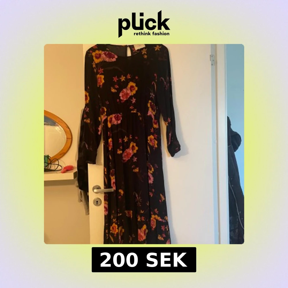 Svart långklänning från JUST i storlek S med färgglatt blommigt mönster i rosa, gult och lila. Klänningen har långa ärmar och rund halsringning. Materialet känns mjukt och lätt, perfekt för dig som gillar romantiska och färgstarka plagg.