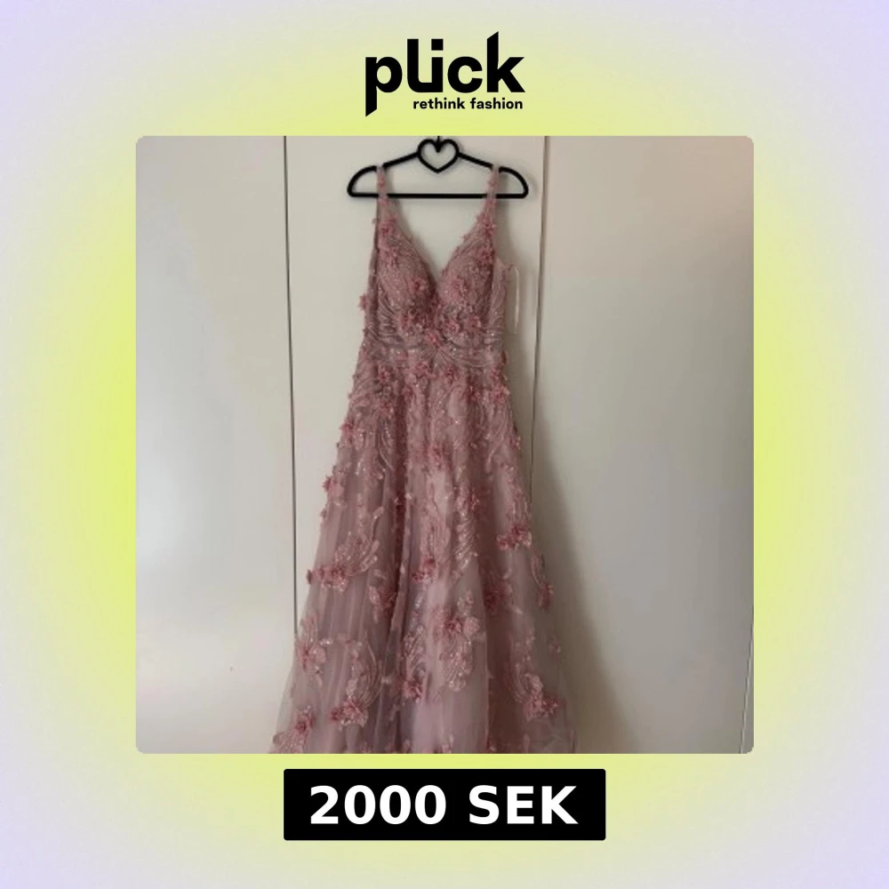 En romantisk rosa långklänning med v-ringad urringning och tunna axelband. Klänningen har vackra blommiga broderier, helt enkelt en dröm balklänning. Har klänningen i två olika storlekar både strlk 12 (motsvarar M) och en i 10 (motsvarar S)