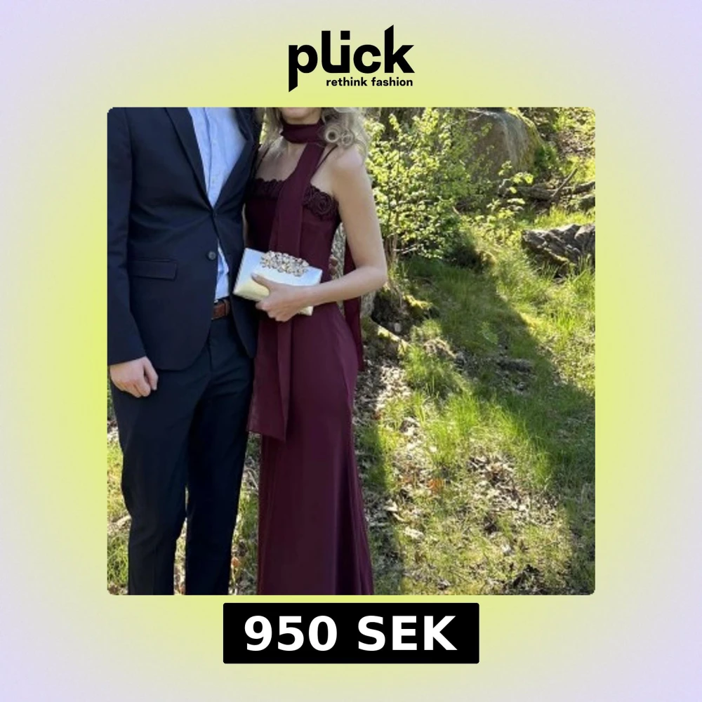 Jätte snygg vinröd långklänning med smala axelband och dekorativa rosdetaljer längs upp. Köpt vintage, passar mig som bär S o går ner till marken (173 cm). Scarf följer med, tyget är följsamt o skrynklar inte! Tar emot bud!
