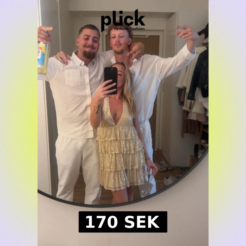 Säljer en glittrig champagnefärgad kortklänning med flera lager volanger och djup v-ringning. Klänningen är axelbandslös och har öppen rygg, vilket ger en snygg och festlig look. Materialet är syntet med paljettdetaljer som verkligen sticker ut.