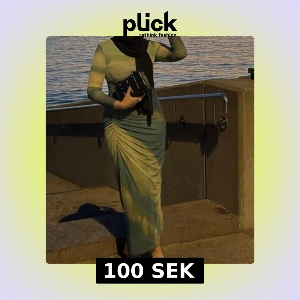 Snygg långklänning i olika gröna nyanser med rynkdetalj längs ena sidan. Klänningen har långa ärmar och en tight passform som framhäver siluetten. Perfekt för dig som vill sticka ut med en unik look.