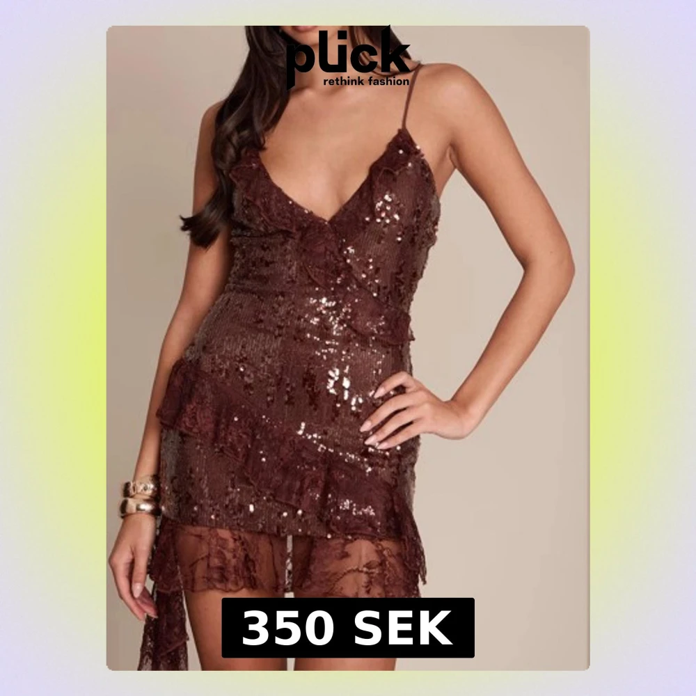 Kort brun klänning med tunna axelband, täckt av glittriga paljetter och volangdetaljer längs omlottkanten och fållen. Klänningen har en djup v-ringning och transparent volangkant nedtill för en extra festlig look. Den är i storlek S men passar allt från xs-m. Den är från PLT och har kvar prislappen!