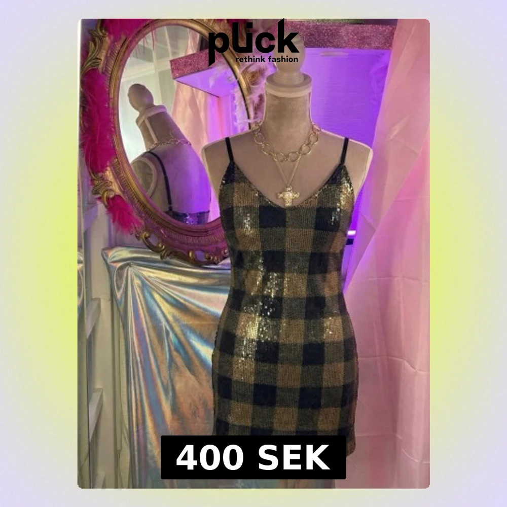Supersnygg kort klänning med tunna axelband. Klänningen har ett rutigt mönster i svart och guld, täckt av glittriga paljetter. Materialet är polyester och den har dragkedja i sidan. Perfekt för dig som vill sticka ut.