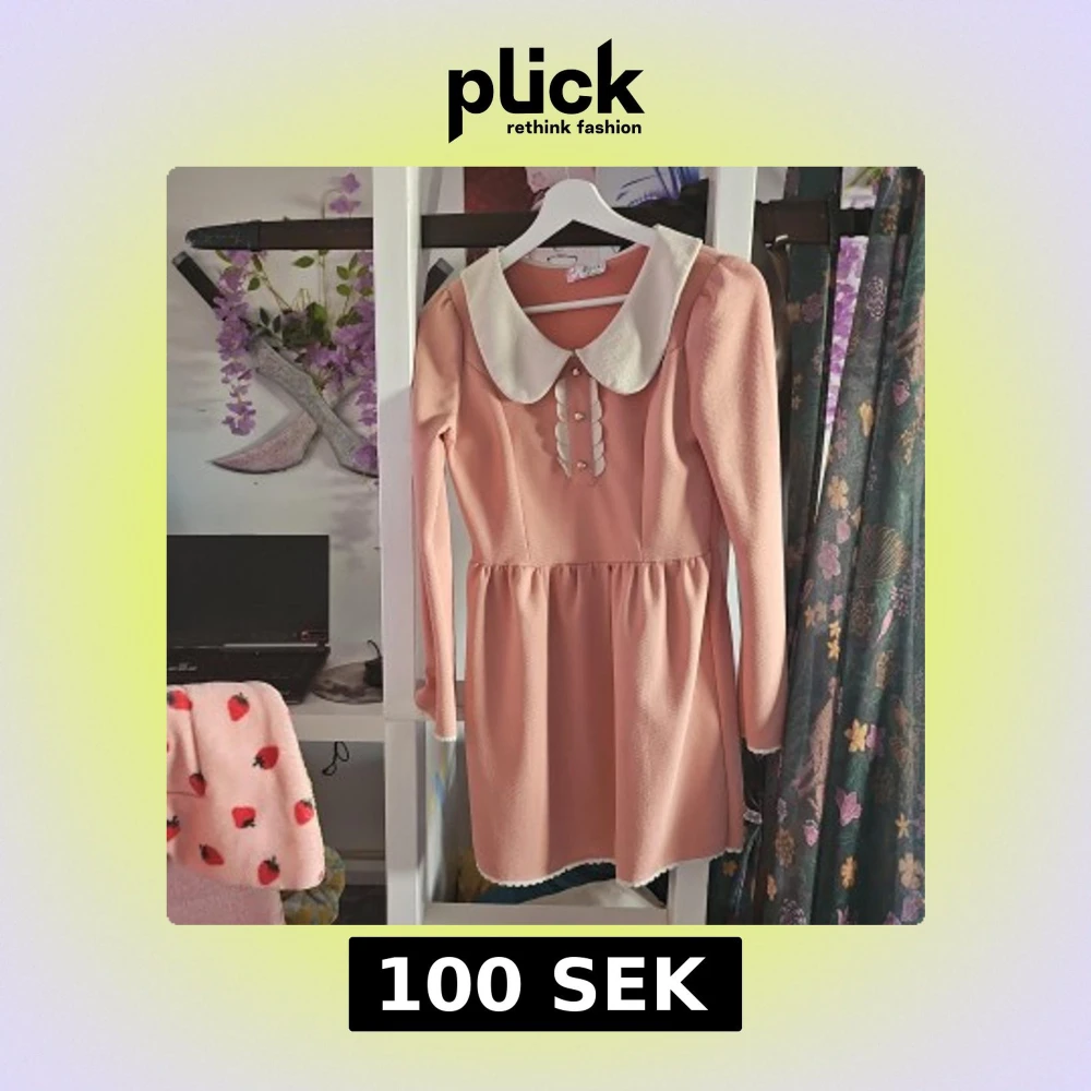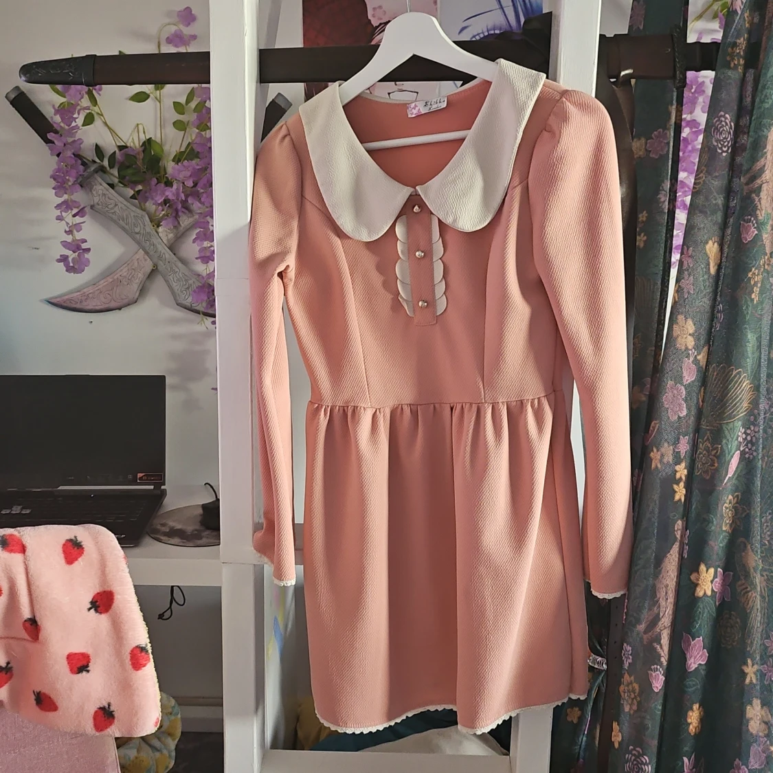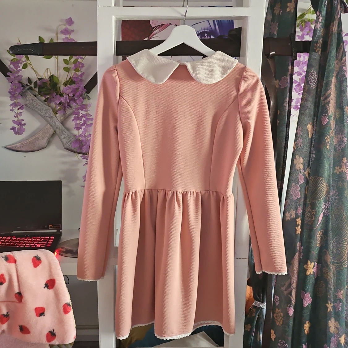 Supersöt kort rosa klänning från Seifini med långärmade ärmar och stor vit krage. Klänningen har dekorativa pärlknappar framtill och scallop-detaljer vid knäppningen. Kjolen är lätt utställd och har vit spetskant längst ner. Perfekt för dig som gillar gullig och unik stil!