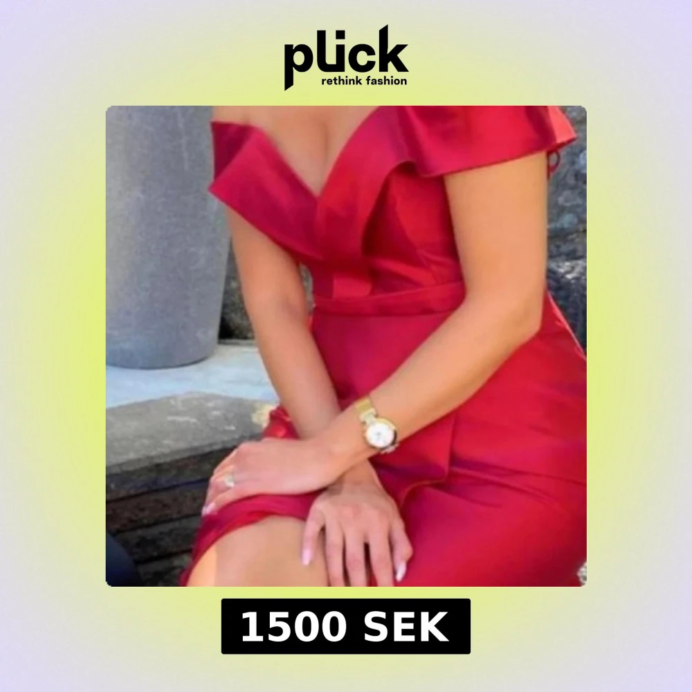 Snygg röd långklänning med offshoulder och v-ringad urringning. Klänningen har en figurnära passform, markerad midja med bälte och en elegant slits. Tillverkad i ett glansigt material som ger en lyxig känsla. Perfekt för bal eller festliga tillfällen.