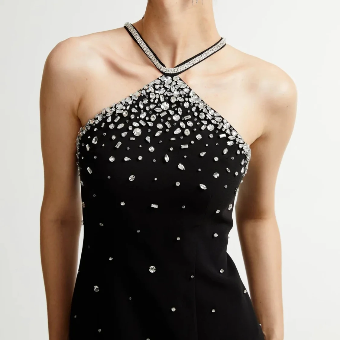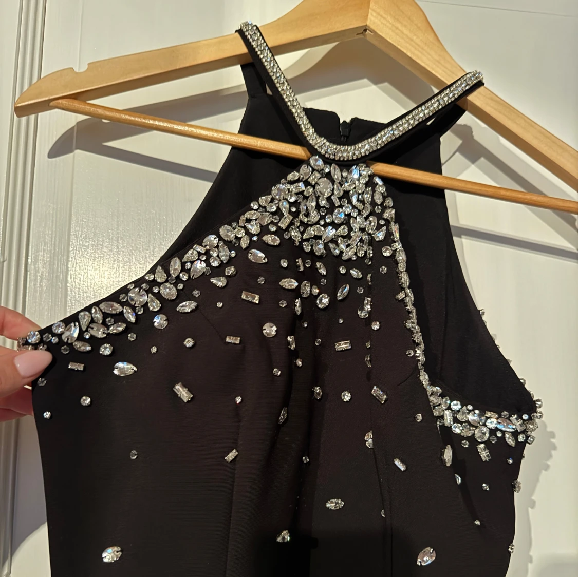 Supersnygg svart kort klänning med glittrande strassdetaljer upptill och på axelbanden. Klänningen har halterneck med smala band och är ärmlös. Perfekt för dig som vill sticka ut med en glamorös look. Materialet känns slätt och följsamt.
