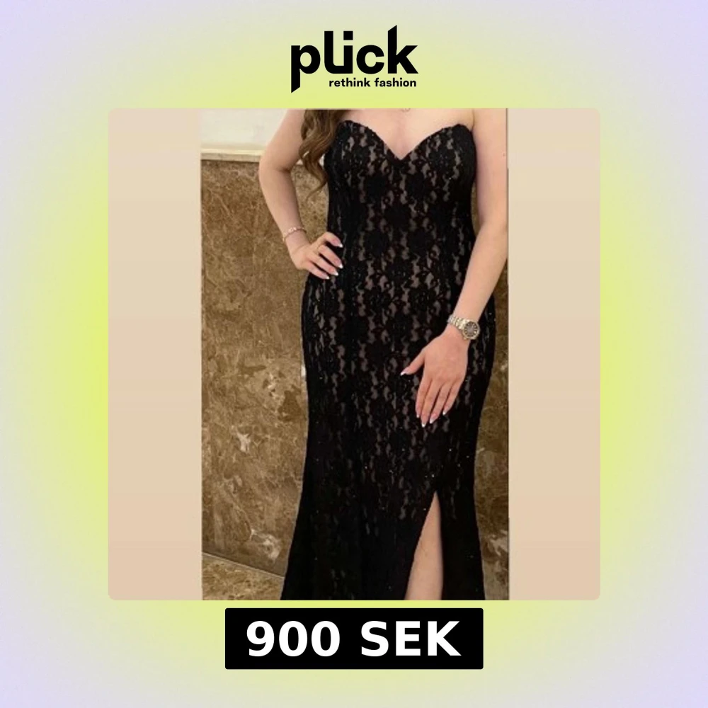 Supersnygg lång svart klänning med spetsdetaljer och hjärtformad urringning. Klänningen är axelbandslös och har en hög slits framtill som ger en extra touch. Perfekt för dig som vill sticka ut på bal eller fest. Materialet är spets med glittriga inslag. Den är använd en gång!