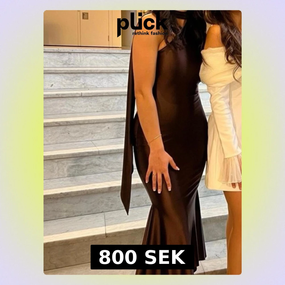 Snygg brun satinklänning med asymmetrisk axel och lång scarfdetalj. Klänningen har figurnära passform och lätt utsvängd nederdel. Perfekt för dig som vill sticka ut med en elegant och modern look. Använd endast en gång, tvättad och ren.