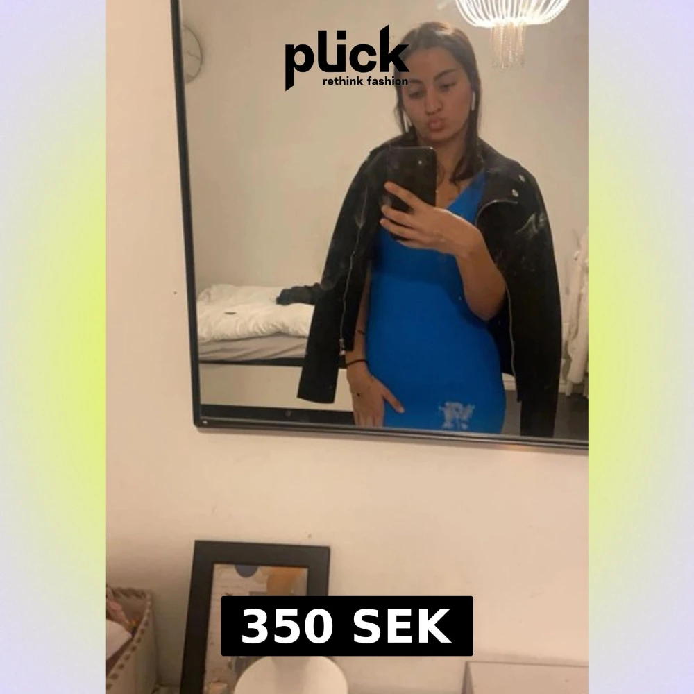 Säljer en snygg blå långklänning med ribbad struktur och v-ringad hals. Klänningen är ärmlös och har en slits på sidan som ger en cool touch. Passformen är tight och materialet känns mjukt och stretchigt, perfekt för dig som gillar att sticka ut med färg.