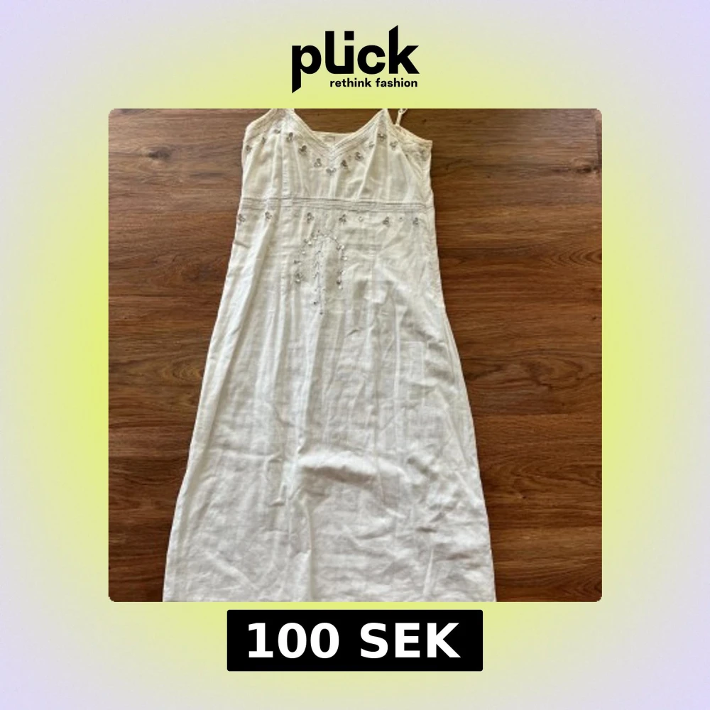 Vit klänning från Fransa med smala axelband och v-ringning som går ungefär till knäna. Klänningen har broderade blommor och små paljetter som ger en glittrig touch. Tillverkad i ett lätt material, perfekt för varma dagar. Snygg och feminin design med fina detaljer.