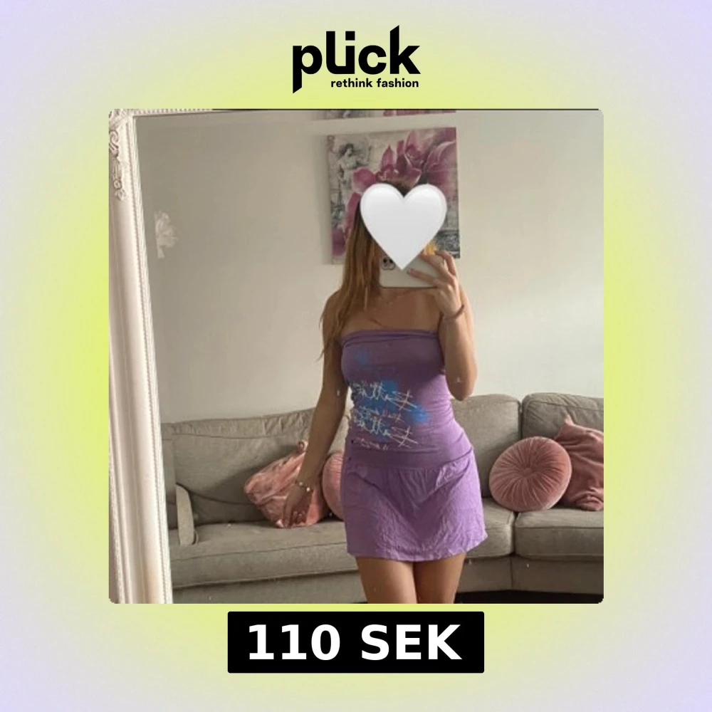 Säljer en lila tubklänning med blått och vitt tryck framtill. Klänningen är axelbandslös och har en kort längd, perfekt för varma dagar. Enkel och snygg design som passar till många tillfällen.