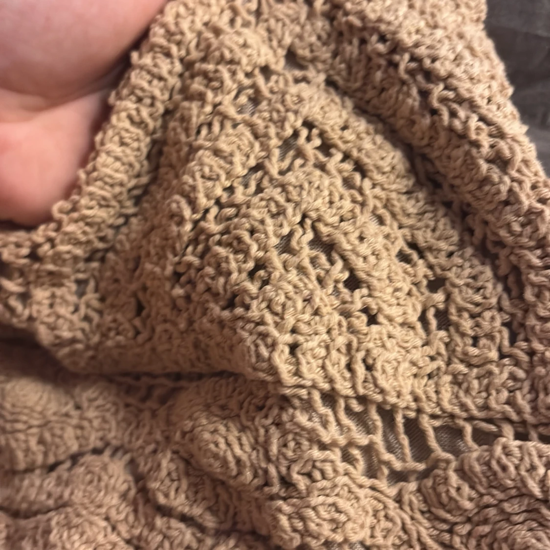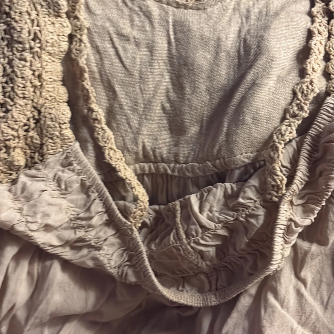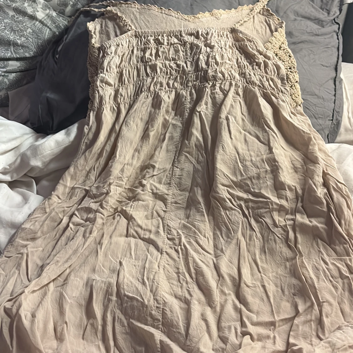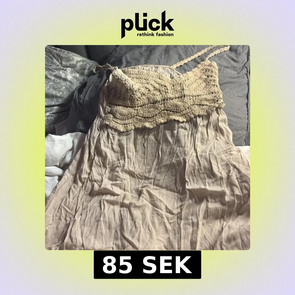 Säljer en söt beige kortklänning med virkad överdel och smala axelband. Kjoldelen är i mjukt, tunt tyg som faller fint och har en lätt skrynklig look. Perfekt för varma dagar och har en bohemisk vibe med sin virkade detalj upptill.