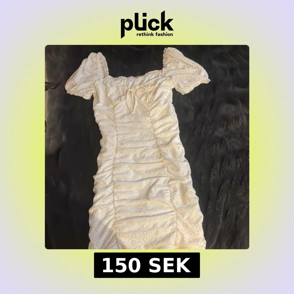 Superfin vit kortklänning med puffärmar och broderade detaljer. Klänningen har omlottknytning vid halsen och är lätt rynkad längs sidorna för en snygg siluett. Storlek S