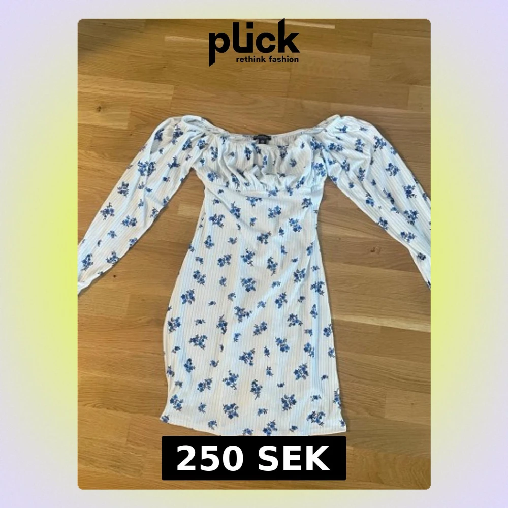 Supersöt vit klänning med blå blommor och diskreta ränder. Klänningen har långärmade puffärmar och en smickrande, figurnära passform med rynkad byst. Perfekt för vår och sommar när du vill känna dig extra fin.