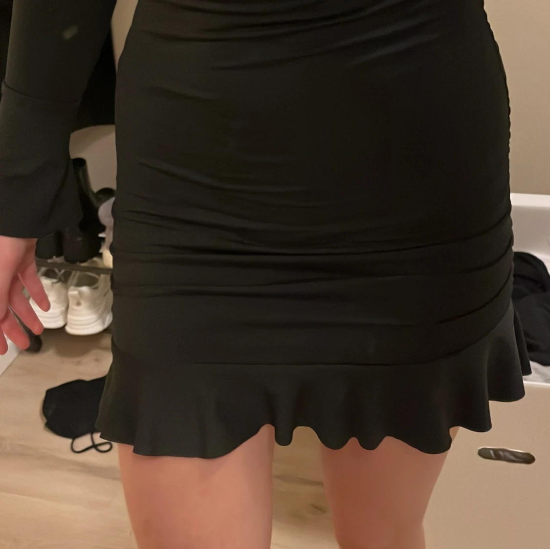 Snygg svart klänning med v-ringning och långa ärmar. Den har en tight passform och en volangdetalj