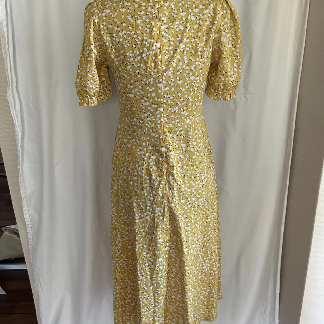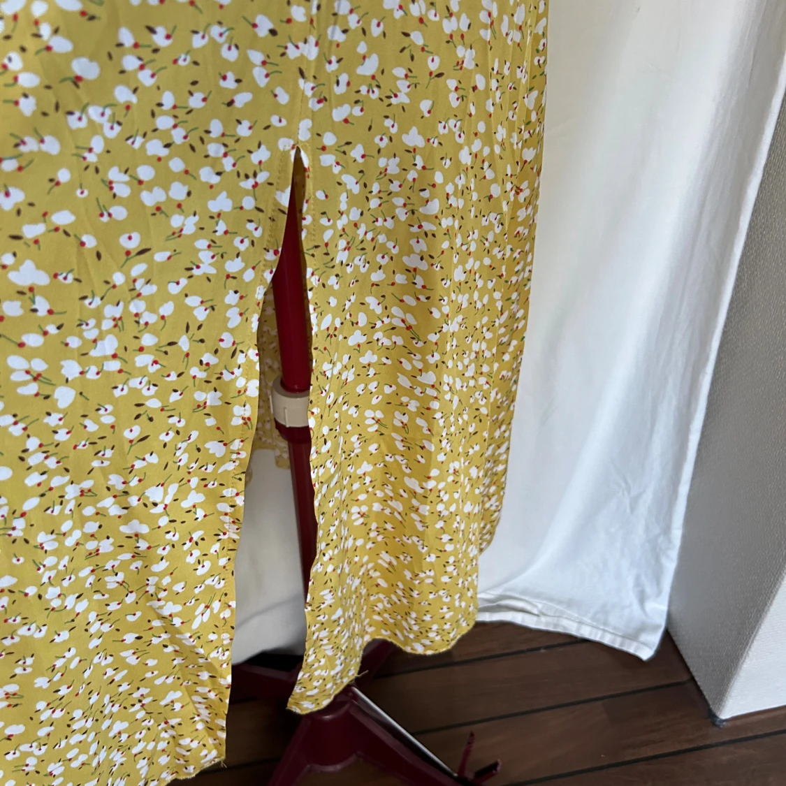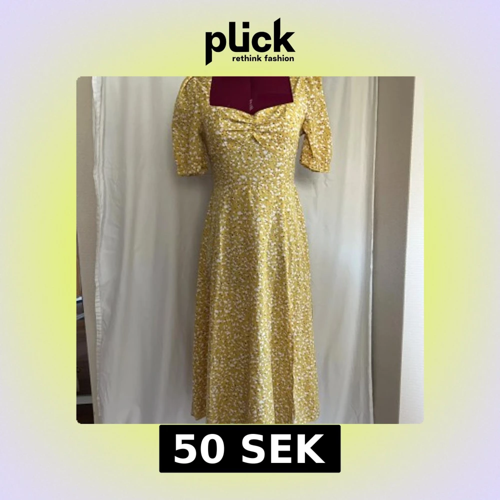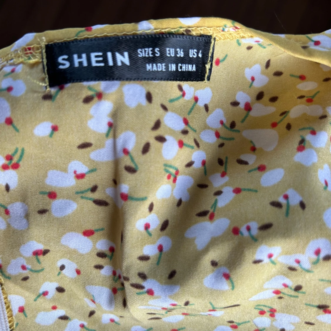 Superfin gul långklänning från SHEIN med vita blommor och små röda detaljer. Klänningen har puffiga korta ärmar, söt rynkdetalj vid bysten och en slits framtill. Den sitter jättefint på kroppen Materialet är mjukt lätt, och skrynkelfritt. Hade jag kommit i den själv hade jag aldrig sålt den.
