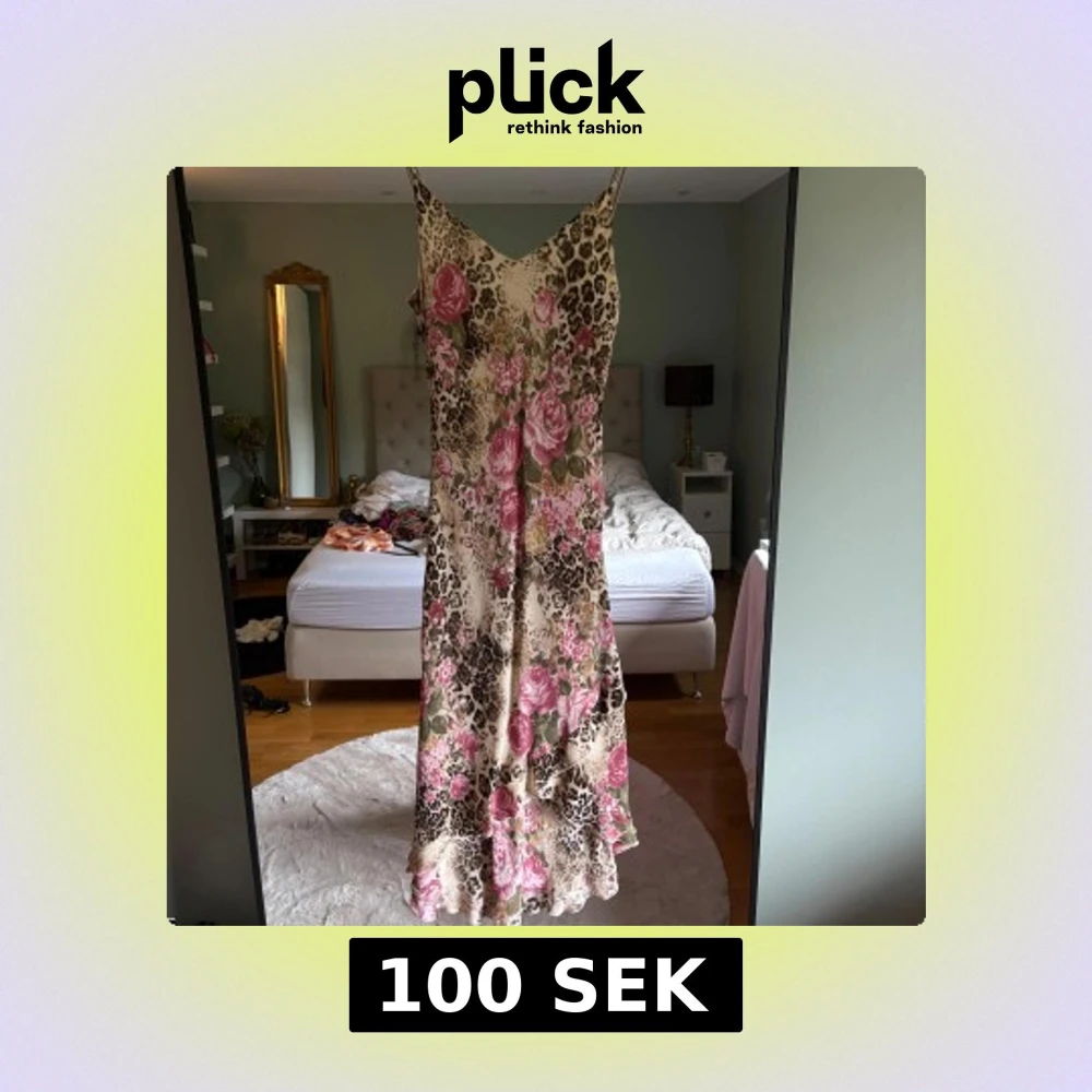 Säljer en snygg slipklänning med leopardmönster och stora rosa blommor. Klänningen har smala axelband, v-ringning och en lätt utsvängd nederdel. Färgerna går i beige, svart och rosa. Perfekt för dig som vill sticka ut med en unik mix av mönster.
