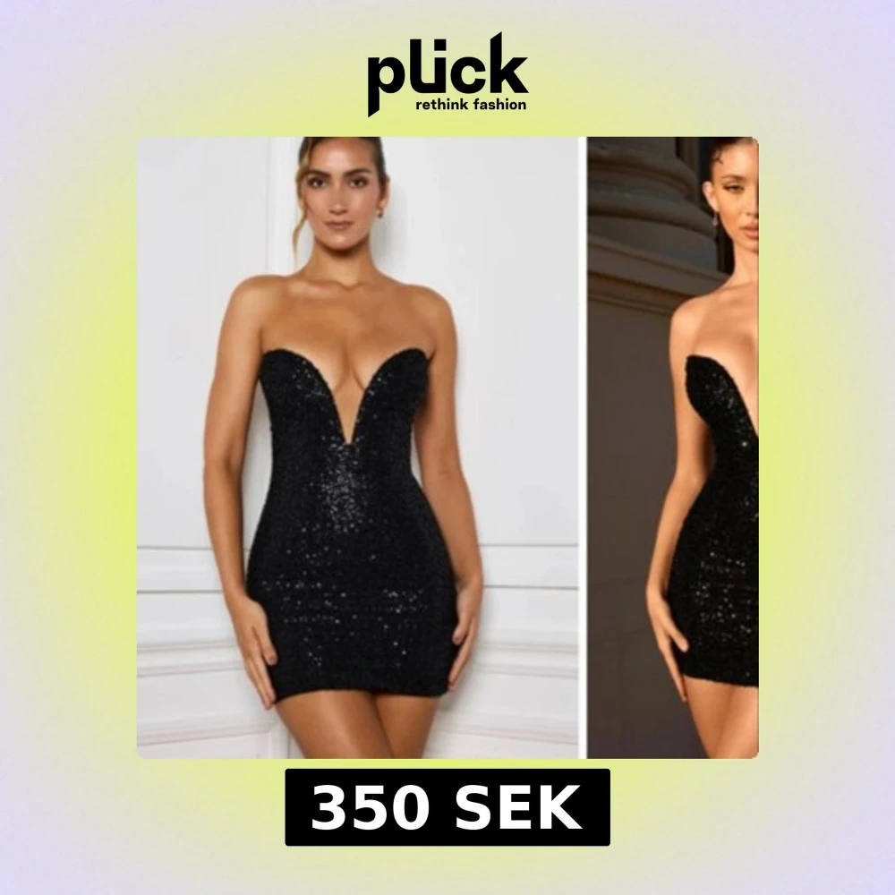 Supersnygg svart paljettklänning med djup v-ringning och öppen rygg. Klänningen är axelbandslös och har en tight passform som framhäver figuren. Kort längd och glittrigt material gör den till ett riktigt statement-plagg. Perfekt för dig som vill sticka ut.