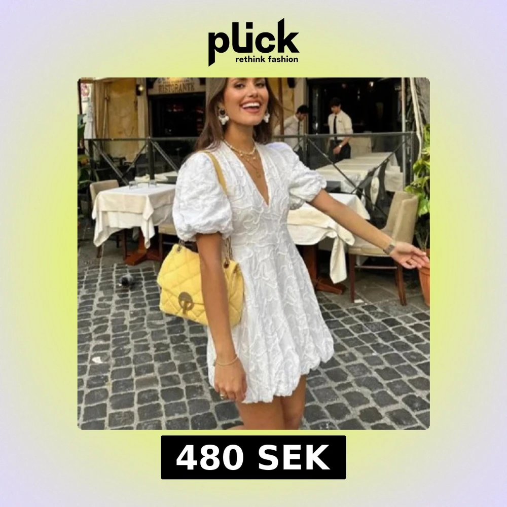 Säljer en söt vit klänning med puffiga kortärmar och v-ringning. Klänningen har ett fint broderat mönster Perfekt för studenten