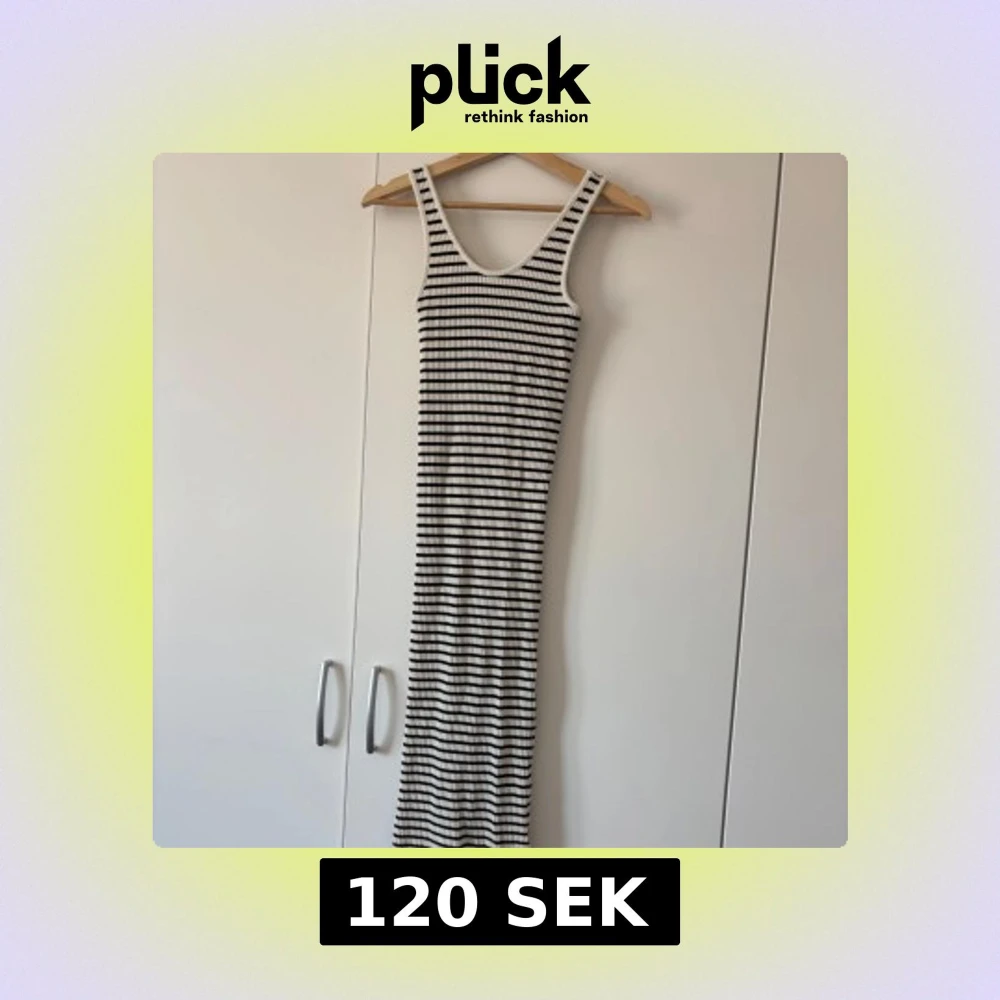 Säljer en snygg långklänning med svarta och vita ränder. Klänningen är ribbad och ärmlös med breda axelband. Perfekt för en stilren och bekväm look. Tyvärr vet jag inte storlek då jag har klippt bort etikett men skulle tippa på att den är S eller XS.