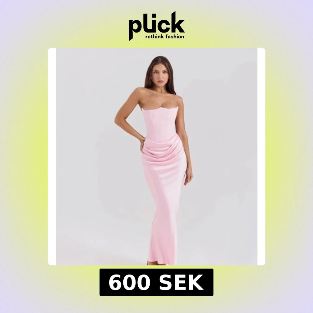 Säljer en elegant ljusrosa långklänning med axelbandslös design och figurnära passform. Klänningen har draperad detalj vid höften och en stilren, minimalistisk look. Perfekt för speciella tillfällen.