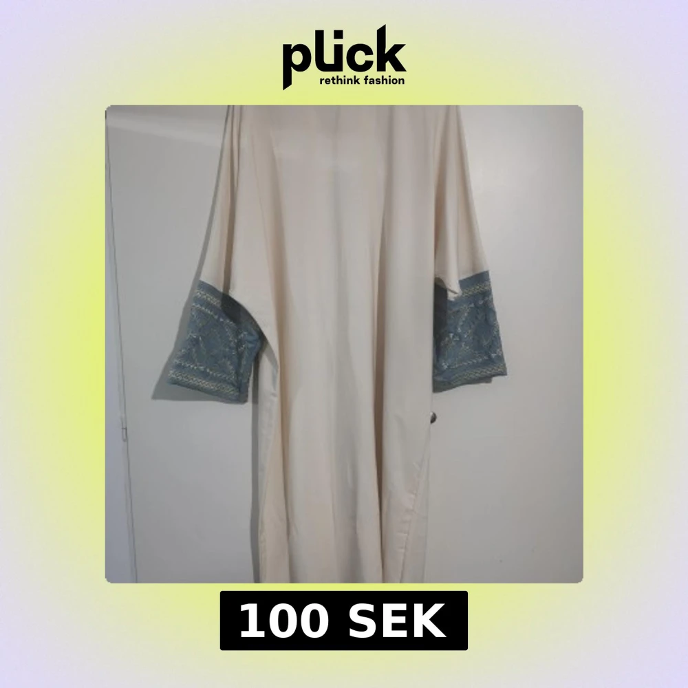 Långklänning i ljus beige med vida ärmar som har blå tygdetaljer och broderade mönster i gult. Klänningen har en rak och lös passform, perfekt för dig som gillar unika detaljer och bohemisk stil.
