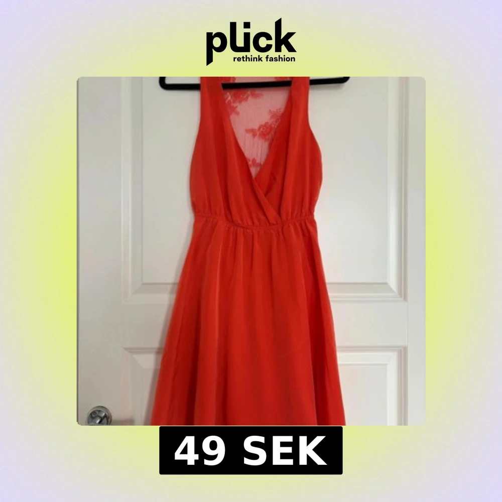 Snygg röd klänning med omlott framtill och djup v-ringning. Baksidan har transparent spets med blommigt mönster. Klänningen har ärmlös design och markerad midja, perfekt för sommarens tillfällen.