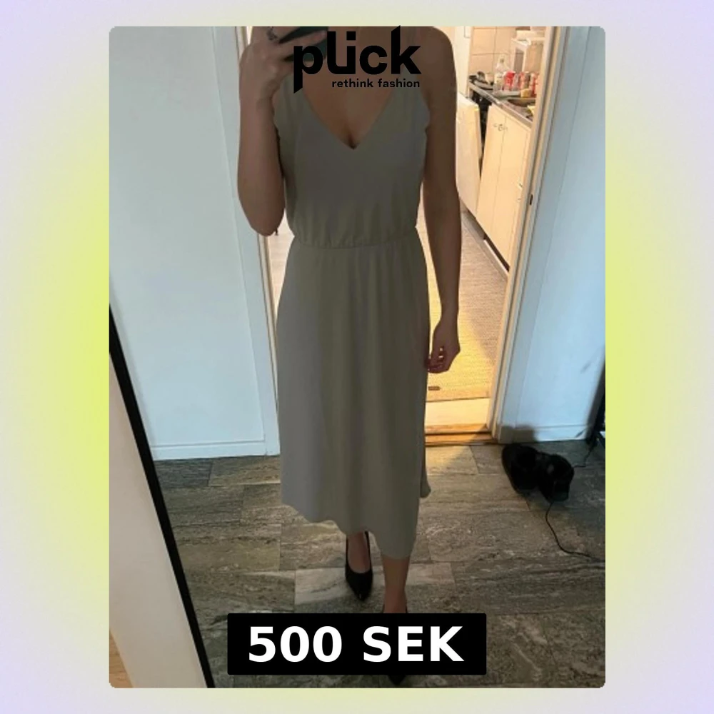 Säljer en stilren ljusgrå/beige långklänning med smala axelband och v-ringning både fram och bak. Midjan är väldigt stretchig så den passar en xs, s och m, endast använd till ett tillfälle så sen är som ny.