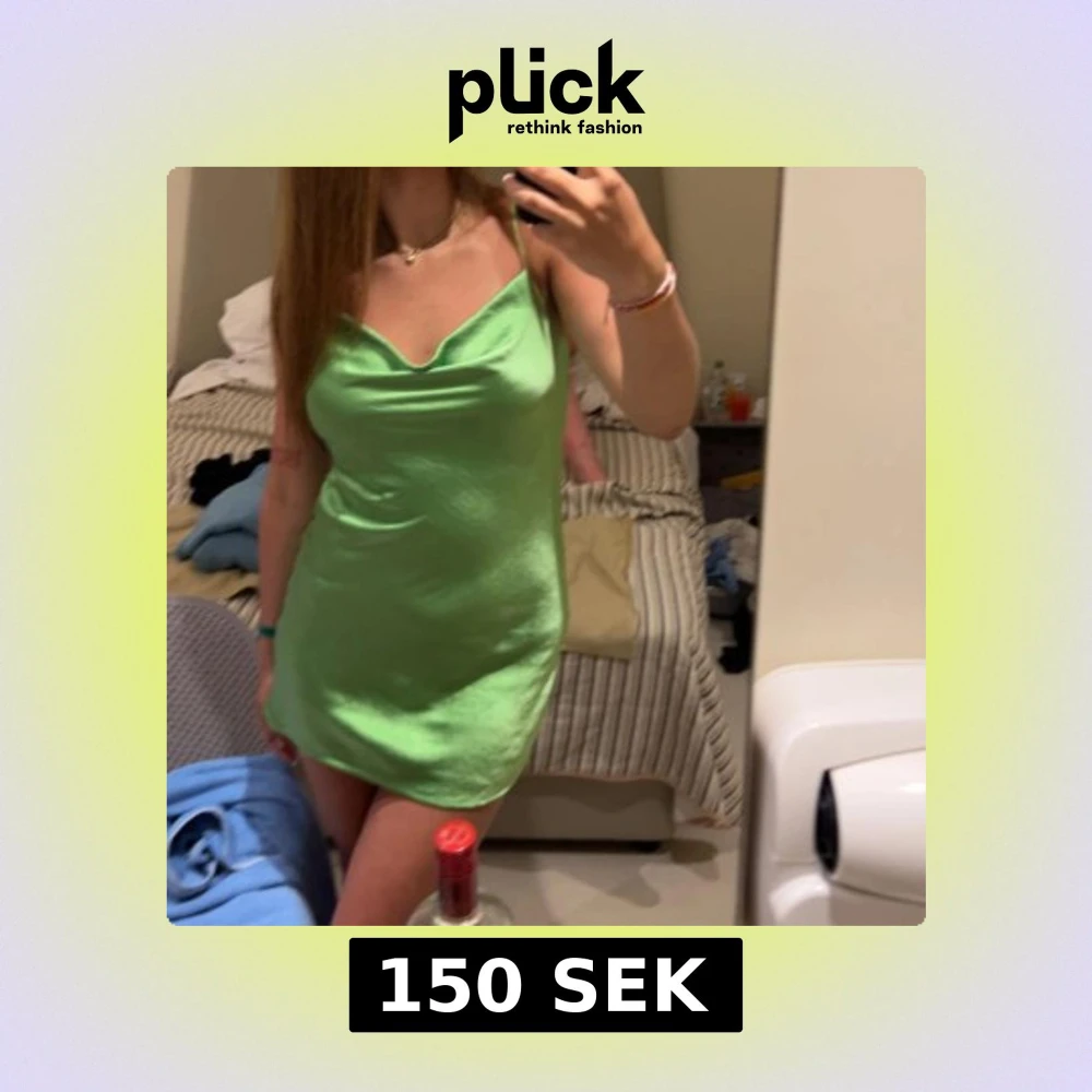Snygg grön kortklänning med smala axelband och en lätt glansig finish. Perfekt för en utekväll eller fest. Klänningen har en enkel och stilren design som framhäver figuren.