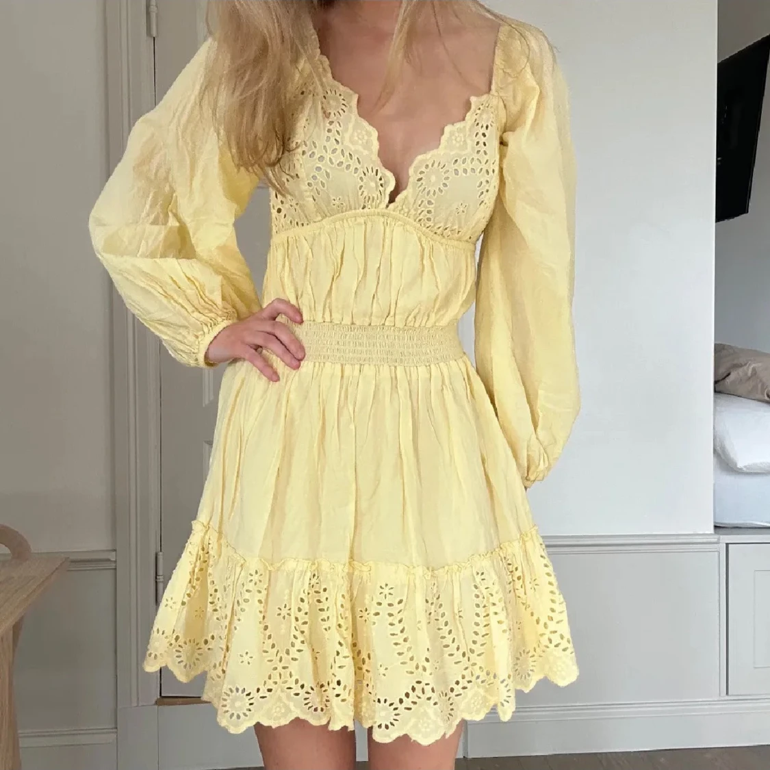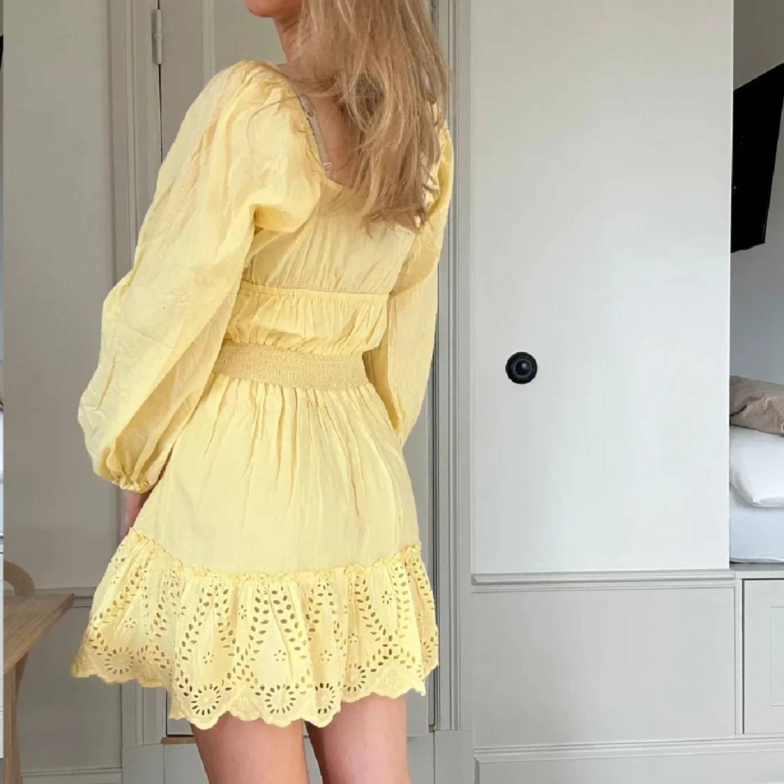 Supersöt ljusgul kort klänning med långa puffärmar. Vet tyvärr inte storlek och märke då lappen är bortklippt, men skulle uppskatta den till en xs/s, skulle säkert passa m också!!