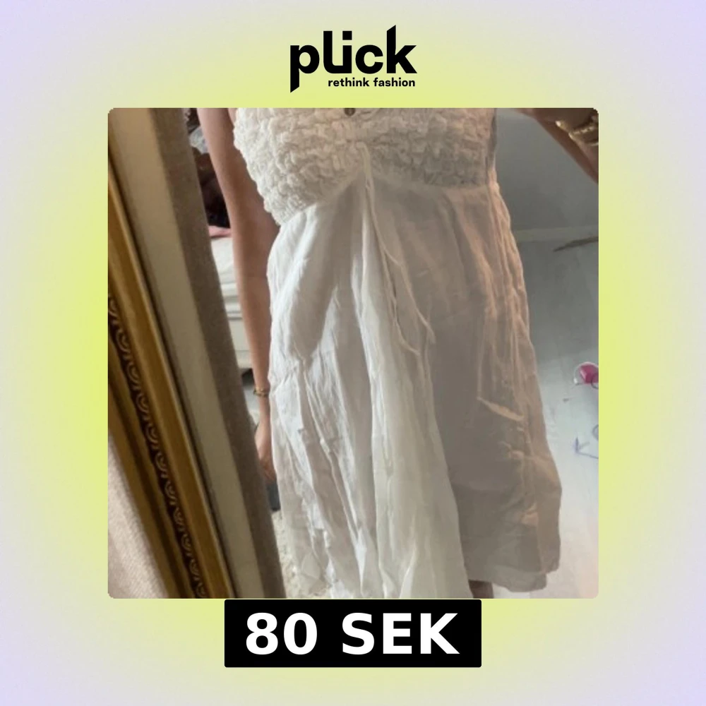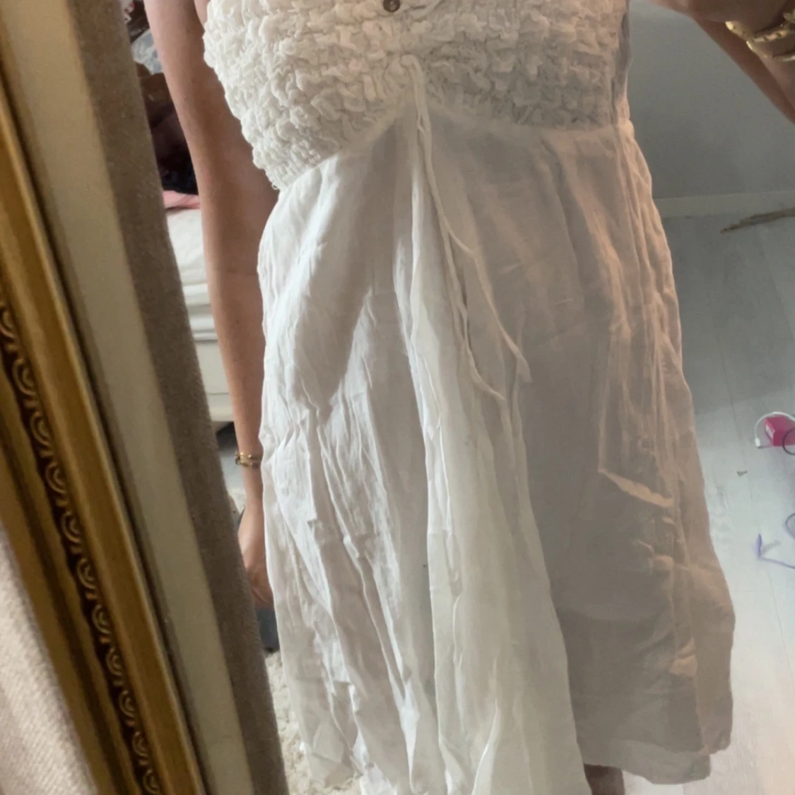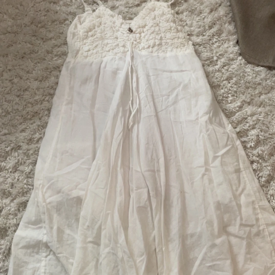 Luftig vit långklänning med smockad överdel och tunna axelband. Klänningen har en lätt volangkänsla upptill och knytband framtill. Perfekt för varma dagar och har en romantisk, bohemisk vibe. Vet ej märke men den är köpt utomlands och passar storlek XS-M