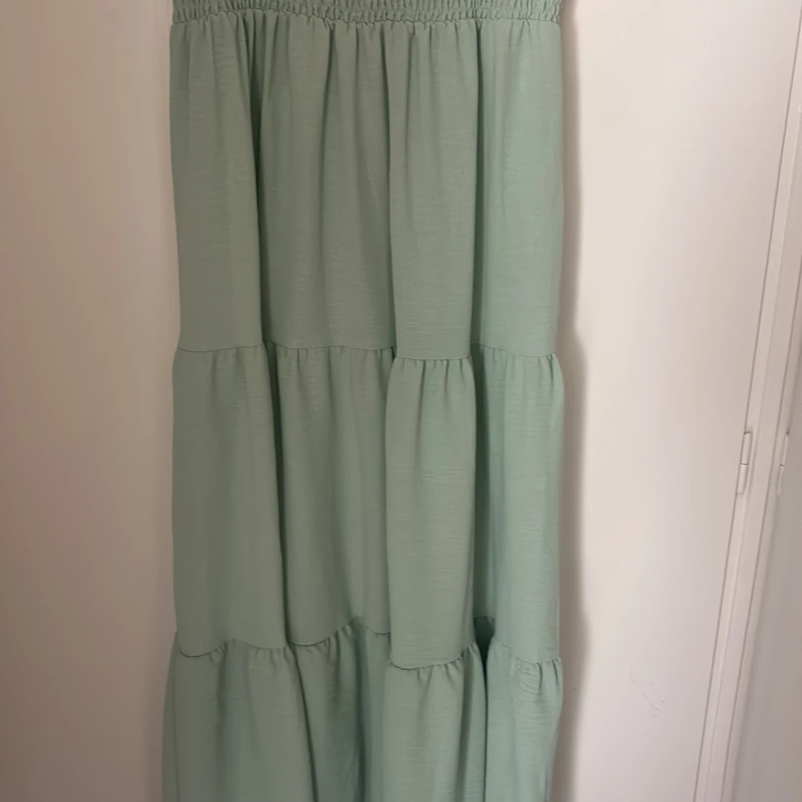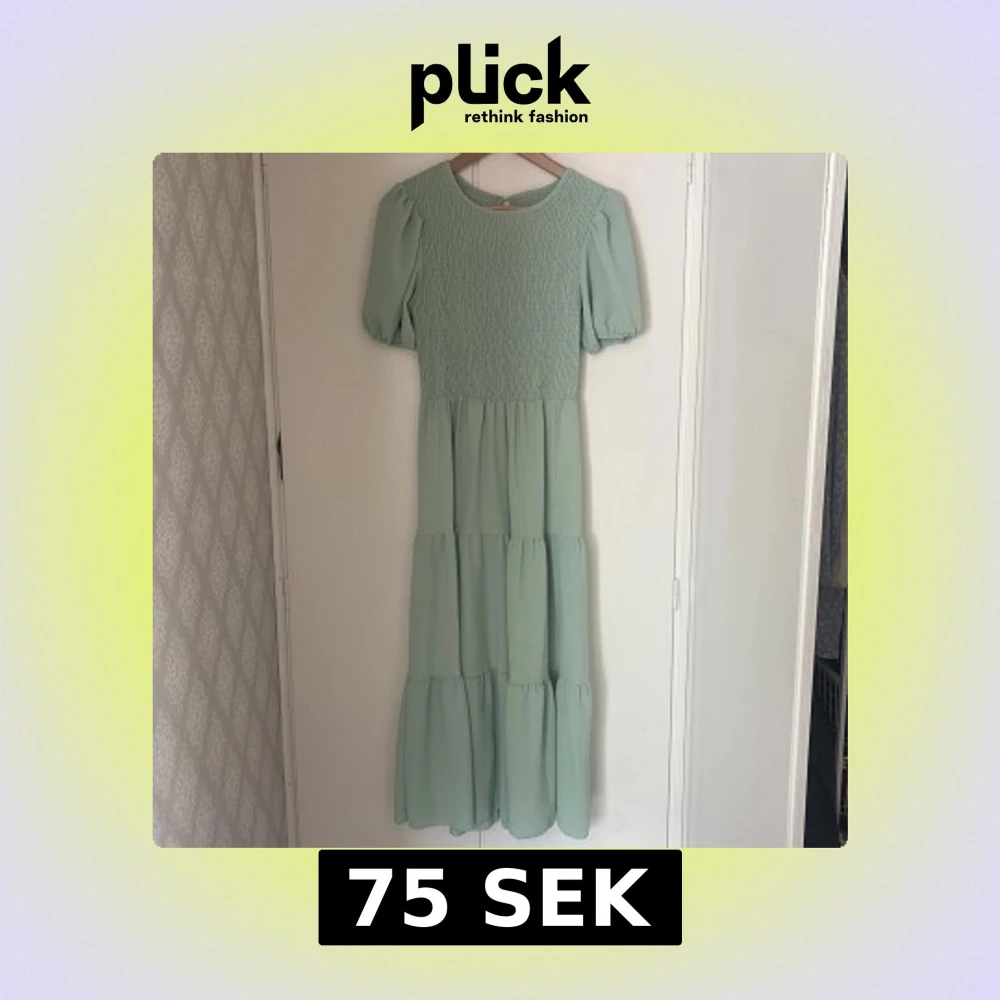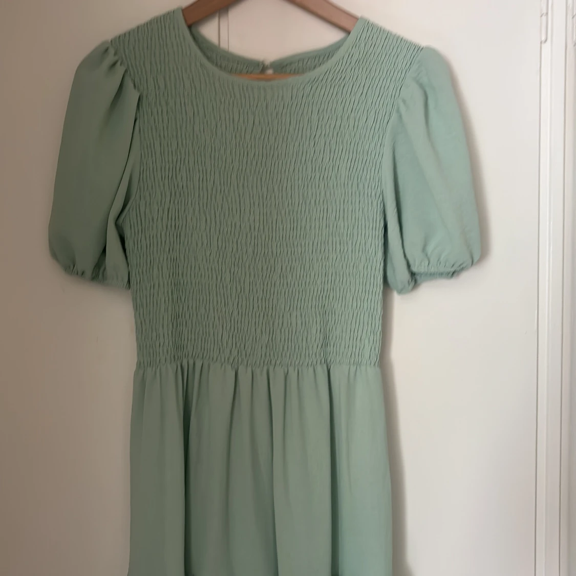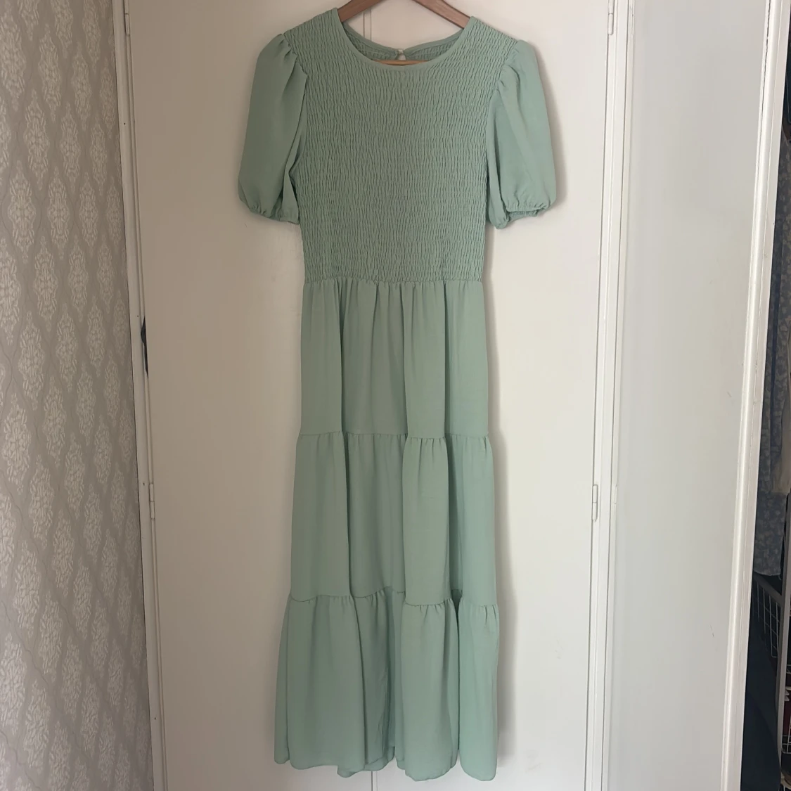 Supersöt ljusgrön långklänning med puffiga kortärmar och smockad överdel. Strl S