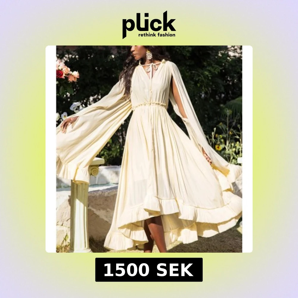 Elegant cremefärgad långklänning med volanger och långa vida ärmar. Klänningen är i Tencell tyg, har en v-ringad design med knytning vid halsen och en smickrande midja. Miss Rosier design. Nypris $215. Helt ny endast provad. Passade tyvärr inte mig.