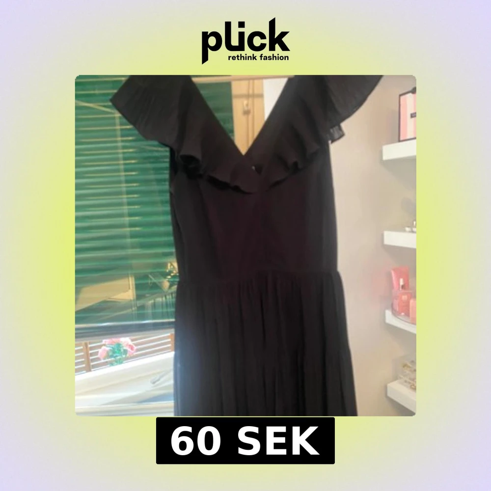 Säljer en svart långklänning med djup v-ringning och bred volang längs axlarna. Klänningen har en luftig och elegant passform, perfekt för speciella tillfällen. Passar dig som gillar stilrena och klassiska plagg.