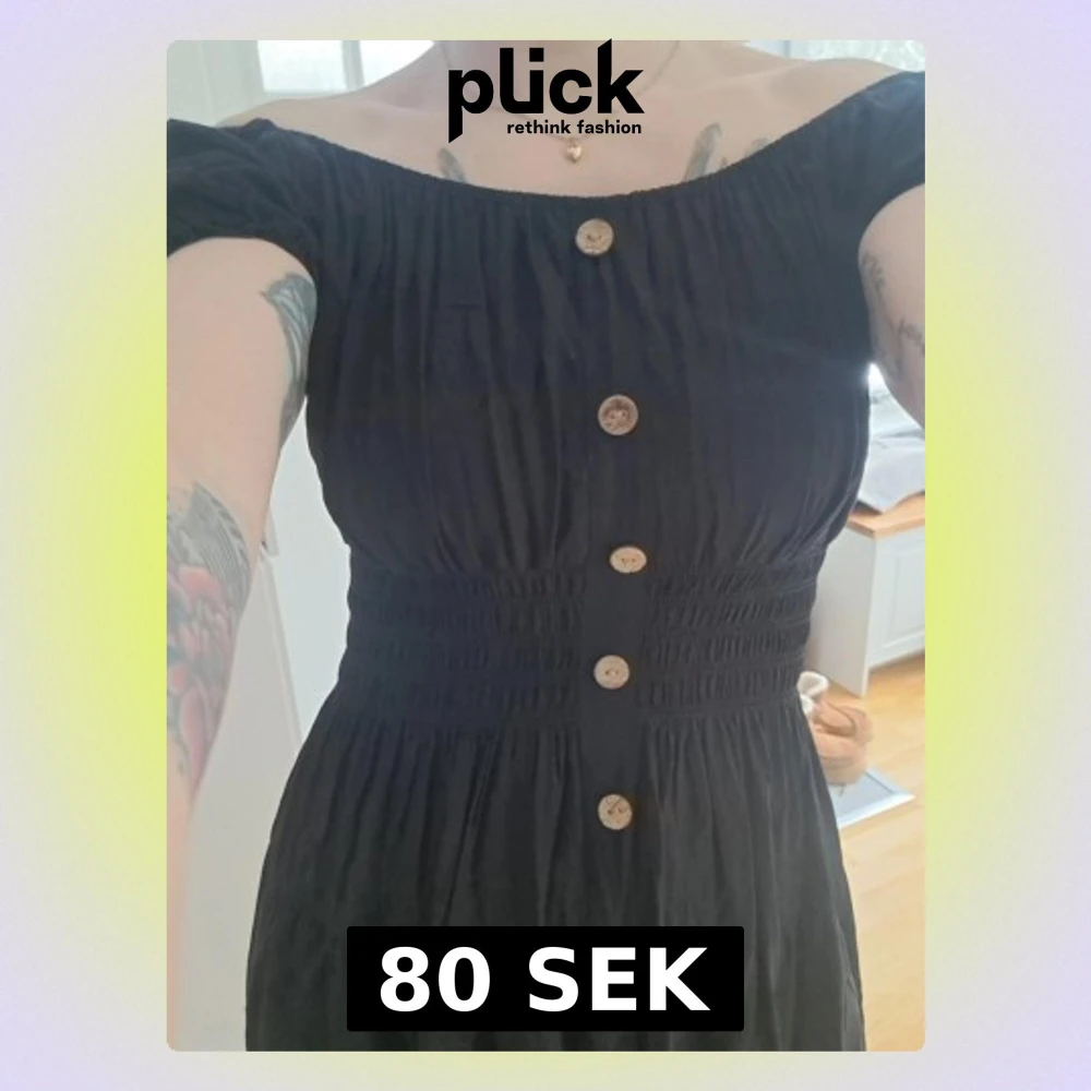 Svart klänning med offshoulder-modell och träfärgade knappar framtill. Klänningen har smockad midja som ger en snygg siluett och kort ärm. Perfekt för dig som gillar en feminin och trendig stil. Mjuk luftig och perfekta på sommaren