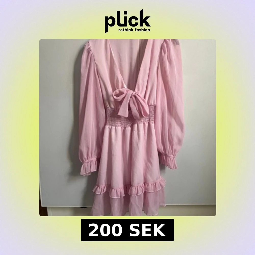 Supersöt ljusrosa kortklänning med volanger, långärmade puffärmar och smock i midjan. Djup v-ringning med knyt fram och volangdetaljer vid ärmslut och kjol. Tunt, flowigt material som ger en romantisk vibe.